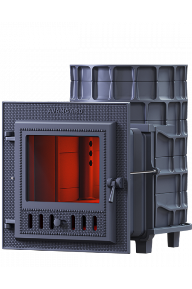 Масса пароиспарителя в печи Аванград 24 – 56 кг, и он нагревается прямым контактом с пламенем. У пароиспарителя 2 поверхности с увеличенной рабочей площадью – снизу идёт нагрев огнём, а сверху поддаётся вода для пара. Для увеличения площади испарения и нагрева первых слоёв камней на каменке отлиты высокие шипы.