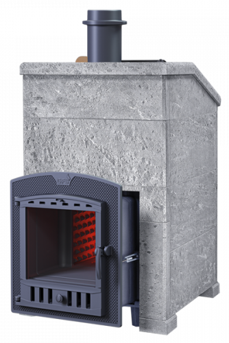 GFS-ЗК 40 – печь с усиленной каменкой большей массы, с единым углублением внутрь топки для дополнительной укладки чугунного заряда. Теплосъемные шипы, со стороны горения пламени, в разы увеличивают площадь соприкосновения огня с каменкой и ускоряют передачу тепла, а также способствуют лучшему дожигу смешивая потоки пламени и воздуха поступаемого из воздушника. Эти усовершенствования значительно повышают мощность парообразования печи и выдают большее количество пара при непрерывной подаче воды. Каменка печей GFS-ЗК является незаливаемой.