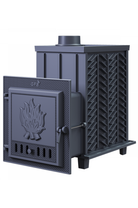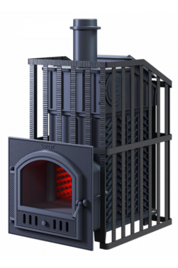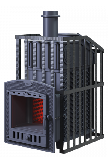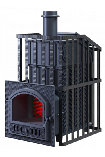 GFS-ЗК 45(П) Ураган – расширенный комплект печи GFS-ЗК в сетке. Максимально приближенный вариант печи для режимов русской парной, имеющий непосредственно закрытую чугунным коробом каменку, дверцу для пара с ручкой из бука, увеличенную до 50см чугунную стартовую трубу. Печь легко модернизируется до полноценной печи предназначенной для Русской бани путем замены стальной сетки на каменную облицовку без демонтажа дымохода.