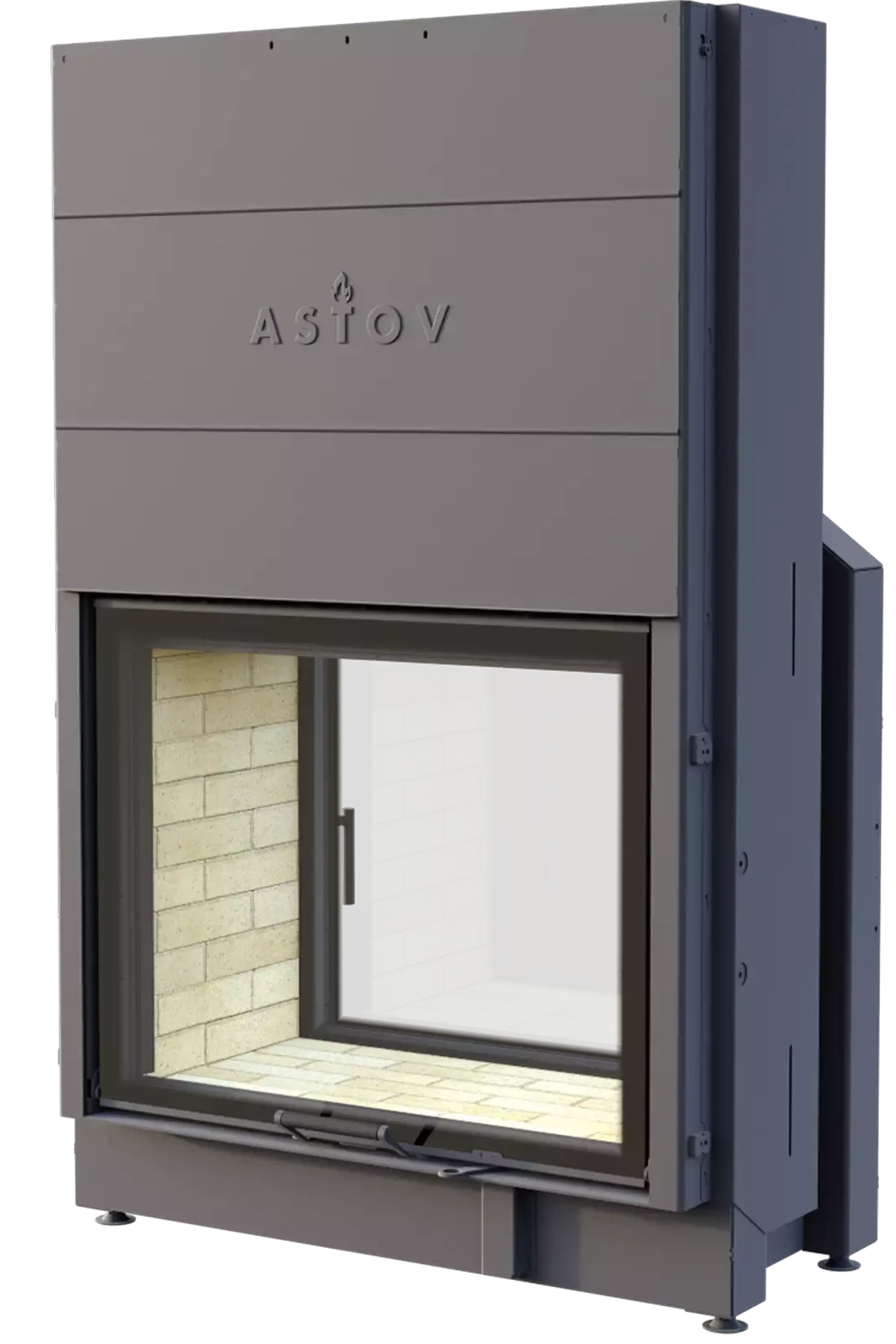 Две дверцы с прямым стеклом. Пространная, сквозная модель, великолепно вписывается в межкомнатные перегородки, для созерцания огня как из гостиной, так и из спальни или кабинета, служит отличной основой, для создания центрального (островного) камина.