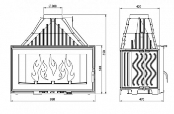 • дефлектор увеличивает тепловую эффективность путем удлинения пути прохождения продуктов сгорания в пространстве каминной топки;