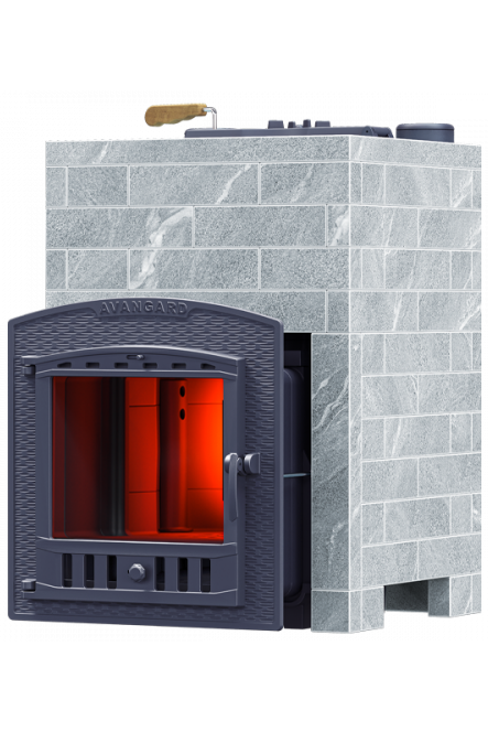 Печь Avangard ЗК 24 (М) является законченным решением для установки в парную русской бани. 4-ёх сторонняя облицовка из природного камня серпентинит выполнена из слэбов толщиной 40мм плотно подогнанных к друг-друг. Облицовка собирается на металлические крепления, без использования цементных растворов. Облицовка останавливает жёсткое инфракрасное излучение и даёт мягкое тепло. Печь снабжена 2-мя паровыми «пушками» для возможности получения мелкодисперсного пара с разных уровней загрузки каменки. Дверца для с деревянной ручкой служит для залповой подачи воды для пара и снабжена поворотной заслонкой для регулировки уровня конвекции.