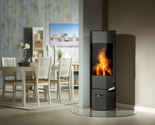Уникальная печь в стиле Hi-Tech от компании ABX (Чехия) – Nagano – успешно завоевала своих почитателей на европейском рынке и продолжает набирать популярность в России. Ровный шестигранник, высокое призматическое стекло, завершенные линии делают печь универсальной в плане места расположения. Печь в номинале рассчитана на обогрев 70 квадратных метров единой площади. Идеальна в угол, пристенно или в островном положении. Ногано прошла сертификацию ECODESIGN, что свидетельствует о высоком качестве исполнения, прекрасном КПД 80%, и соответствию требовательным эконормам. Стекло премиального качества от немецкого производителя Schott выдерживает температурные нагрузки до 750°С, что является двойным запасом жаропрочности по отношению к достигаемым значениям в топке печи. Обратите внимание – стекло призматическое цельногнутое, это исключает поступление холодного воздуха от стыковочных зон. Данное свойство повышает температуру внутри топки и делает горение более чистым, исключая накопление сажи на стекле и футеровке. Кстати, футеровка выполнена из вермикулита, прекрасного теплоотражающего минерала, повышающего КПД печи. Для лучшей тяги вы можете подключить печь к системе забора внешнего воздуха. Управление подачей воздуха осуществляется однорычажным механизмом, под дверцей. Ручка открывания утоплена заподлицо, не выступает и не мешает эстетическому наслаждению от созерцания пламени. Гарантия от завода 5 лет.