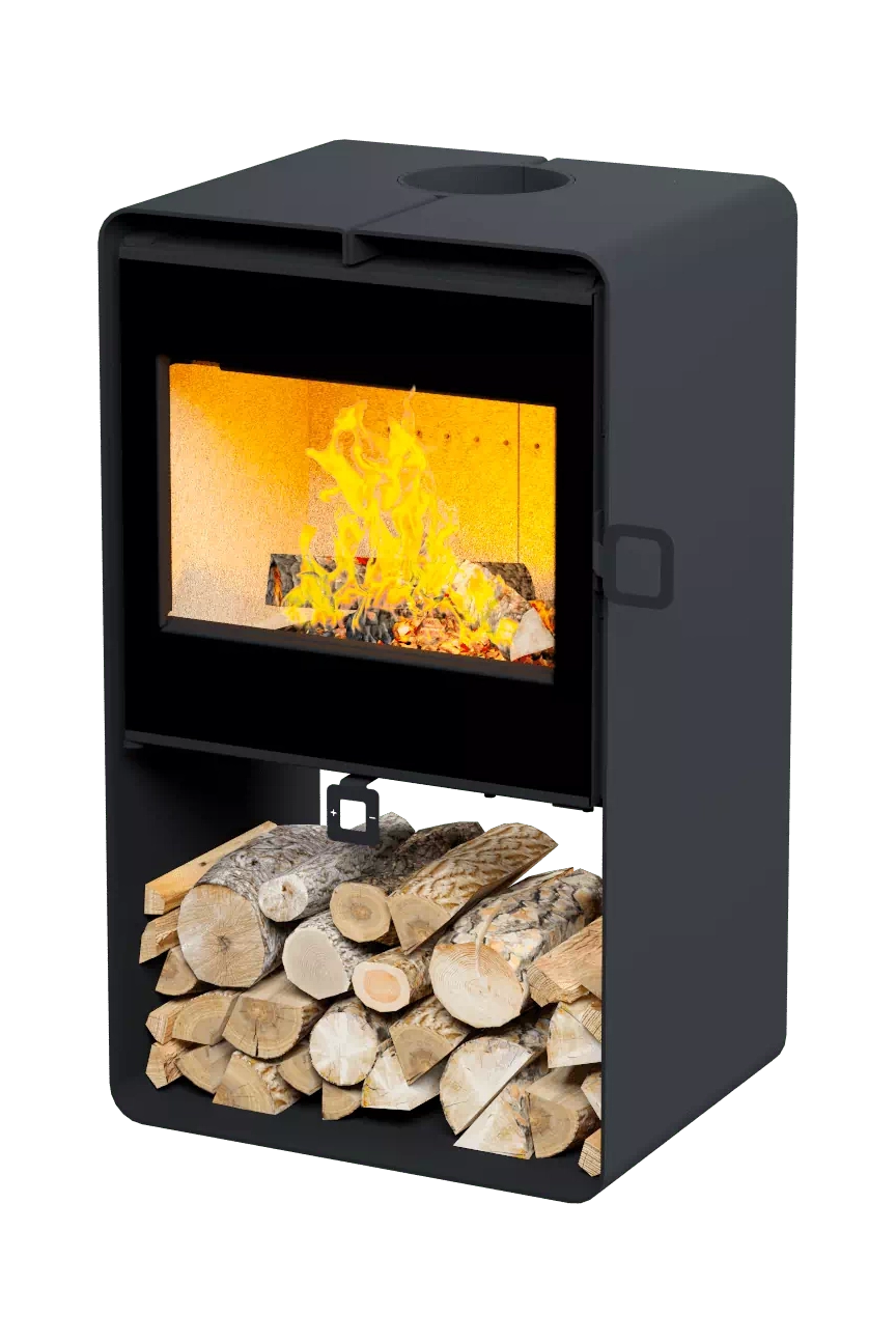 Минималистичный корпус печи-камина имеет встроенный дровник и изготовлен из стали, которая окрашена в чёрный цвет.