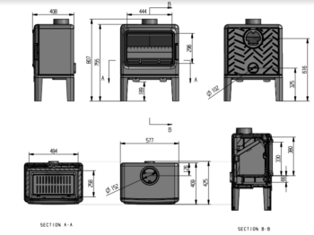 В большую топку помещаются дрова длиной 40 см. Внутри топки находится отбойник пламени, который препятствует уходу огня прямо в дымоход, заставляя сделать оборот, что увеличивает КПД печи. А система подачи вторичного воздуха дожигает улетающие в трубу частички топлива, благодаря чему образуется меньше золы и дольше остается чистым дымоход.
