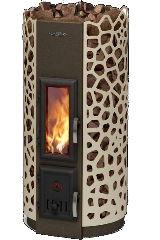 Камни долго держат тепло, хорошо экранируют сильное тепловое излучение от металлической топки и прекрасно нагревают воздух помещения естественной воздушной конвекцией через сетчатый кожух.