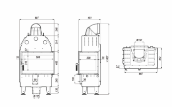 Топка Intra обладают отличной номинальной мощностью в 10 кВт, диапазон заявленной мощности от 4 до 12 кВт в пике. Высокое КПД – 80% позволяет экономично расходовать топливо. В данной топке Вы можете использовать дрова до полуметра. Топка футерована внутри фирменной керамикой Keramiton – материалом повышенной плотности и теплоемкости. Чтобы равномерно отвести тепло, на куполе и корпусе размещены теплоотводящие ребра и внутренние каналы в дымосборнике. Система подключения внешнего воздуха для забора воздуха с улицы или других помещений, позволяет минимизировать влияние разряженности воздуха.
