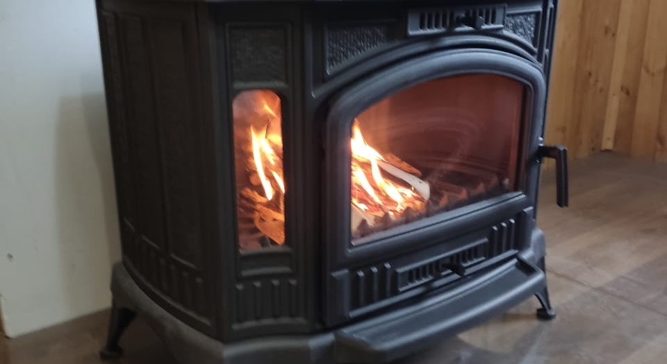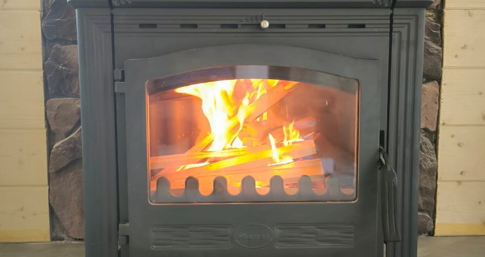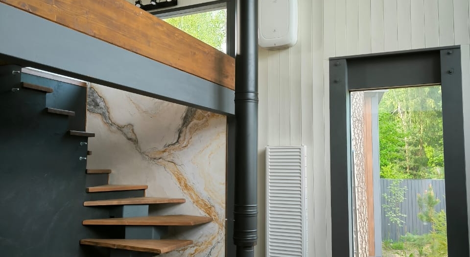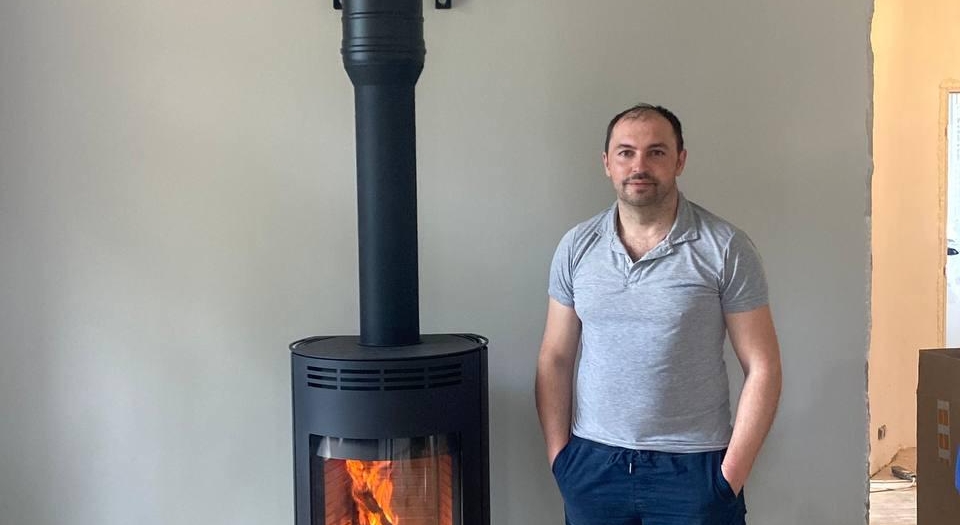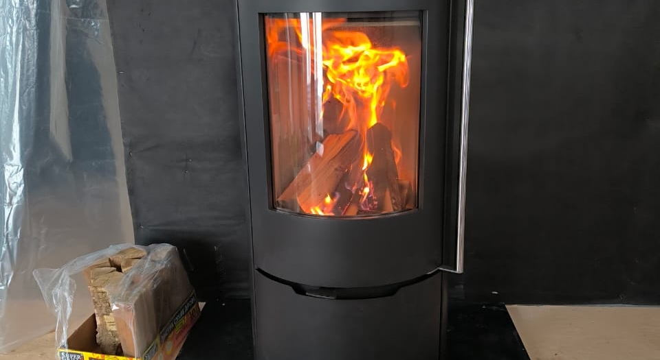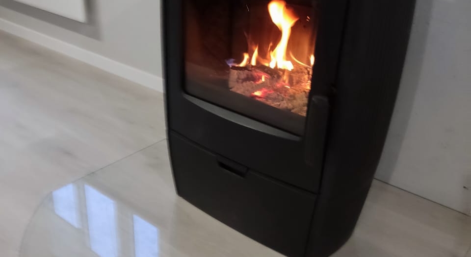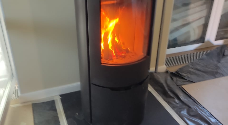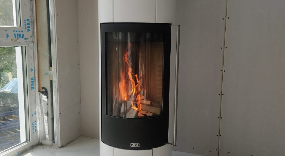 Astov R1 на тумбе и дымоход Schiedel Permeter 25