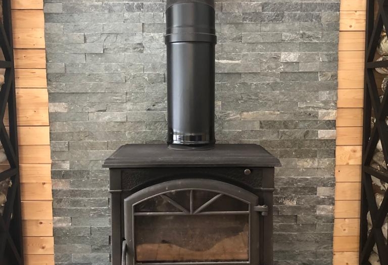 Печь-камин Everest 12 установлен на стекло, черные стартовые трубы в цвет, колено с ревизией, на улице установлены жесткие растяжки от кровли