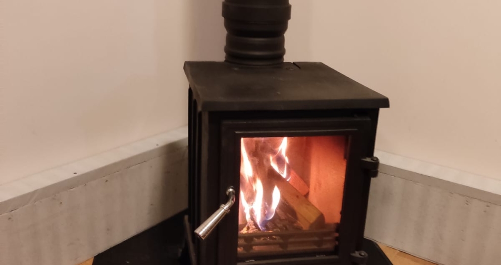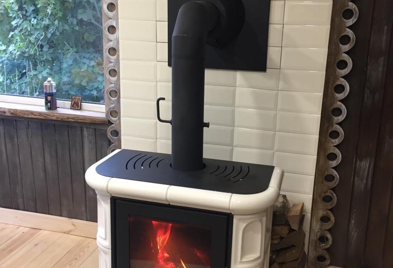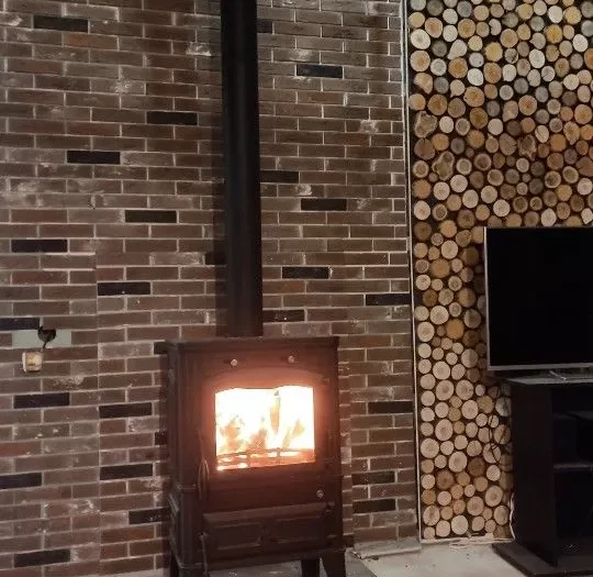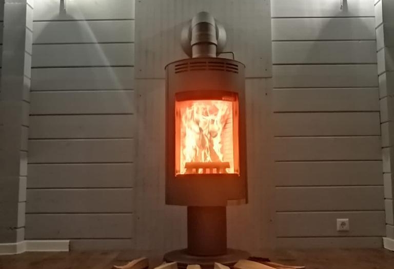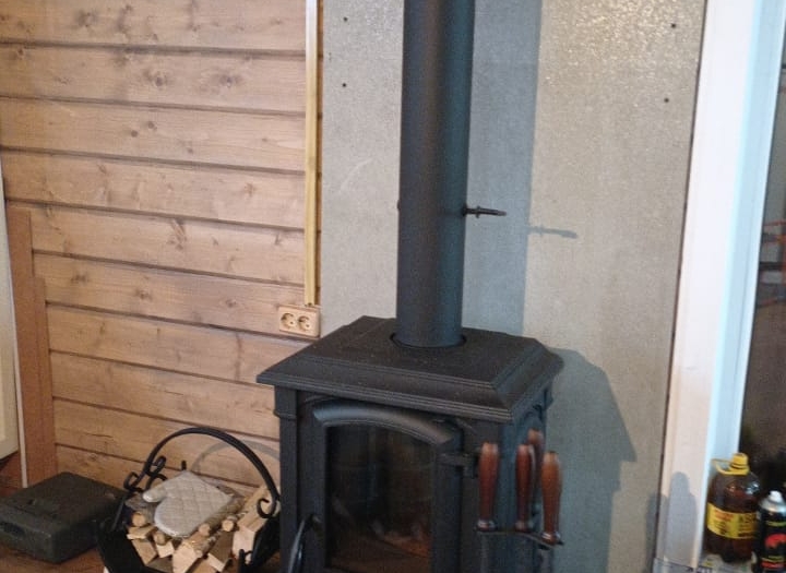 Печь камин Инвикта Шатель, установлена на стекло, за печью изоляция из суперизола закрепленная с вент зазором через втулки, утеплённая часть дымохода покрашена порошковой краской, углы использованы чтобы обойти балку